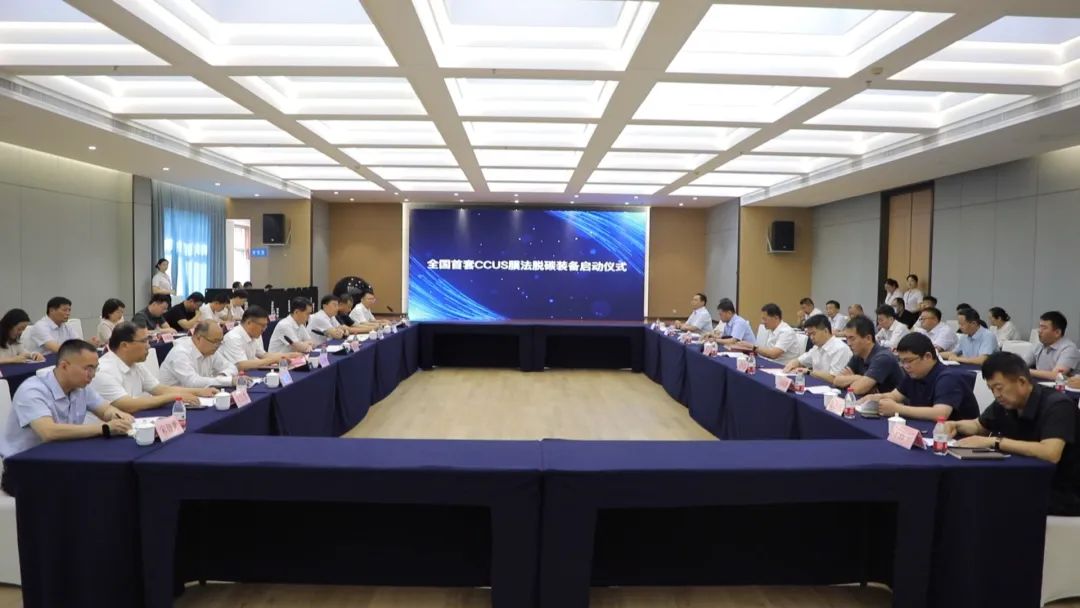 與會代表李寶、劉子軍、許孝磊、牟煥民、邵現(xiàn)振、謝忠寶、高志剛上臺共同按動啟動球,標(biāo)志著全國首套CCUS膜法脫碳工業(yè)化試驗裝備項目正式啟動。